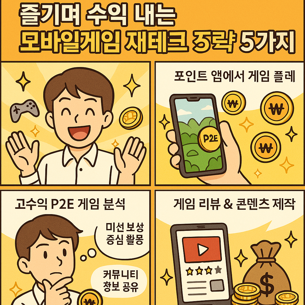 이 글에서는 누구나 스마트폰 하나로 실천할 수 있는 모바일게임 재테크 전략 5가지를 소개합니다. 단순히 재미만을 위한 게임이 아니라, 시간을 투자하면 현금화 가능한 수익으로 연결되는 실질적인 방법을 다룹니다. P2E 게임, 광고 리워드, 포인트 앱 연동 게임 등을 통해 작지만 꾸준한 부수입을 얻고 싶은 분께 추천합니다.